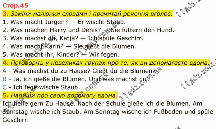 Заміни малюнки словами і прочитай речення вголос. 1. Was macht Jürgen? — Er wischt Staub. 2. Was machen Harry und Denis? — Sie füttern den Hund. 3. Was machst du, Katja? — Ich spüle Geschirr. 4. Was macht Karin? — Sie gießt die Blumen. 5. Was macht ihr, Kinder? — Wir fegen. 4. Поговоріть у невеликах групах про те, як ви допомагаєте вдома. A - Was machst du zu Hause? Gießt du die Blumen? B - Ja, ich gieße die Blumen. Und was machst du? C - Ich fege wische Staub. 5. Напиши про свою допомогу вдома. Ich helfe gern Zu Hause. Nach der Schule gieße ich die Blumen. Am Samstag wische ich Staub. Am Sonntag wische ich Fußboden und spüle Geschirr.