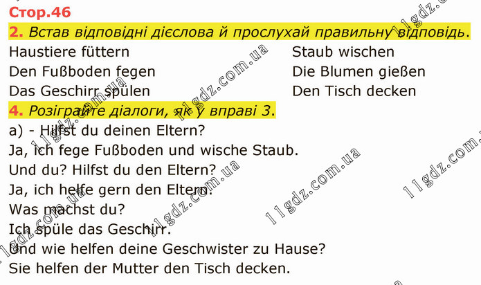 Встав відповідні дієслова й прослухай правильну відповідь. Haustiere füttern Den Fußboden fegen Das Geschirr spülen Staub wischen Die Blumen gießen Den Tisch decken 4. Розіграйте діалоги, як у вправі 3. а) - Hilfst du deinen Eltern? - Ja, ich fege Fußboden und wische Staub. - Und du? Hilfst du den Eltern? - Ja, ich helfe gern den Eltern. - Was machst du? - Ich spüle das Geschirr. - Und wie helfen deine Geschwister zu Hause? - Sie helfen der Mutter den Tisch decken.