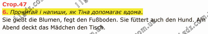 Прочитай і напиши, як Тіна допомагає вдома. Sie gießt die Blumen, fegt den Fußboden. Sie füttert auch den Hund. Am Abend deckt das Mädchen den Tisch.