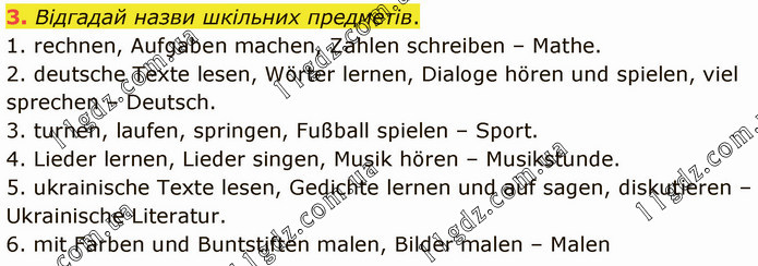 Відгадай назви шкільних предметів. 1. rechnen, Aufgaben machen, Zahlen schreiben – Мathe. 2. deutsche Texte lesen, Wörter lernen, Dialoge hören und spielen, viel sprechen – Deutsch. 3. turnen, laufen, springen, Fußball spielen – Sport. 4. Lieder lernen, Lieder singen, Musik hören – Musikstunde. 5. ukrainische Texte lesen, Gedichte lernen und auf sagen, diskutieren – Ukrainische Literatur. 6. mit Farben und Buntstiften malen, Bilder malen – Malen