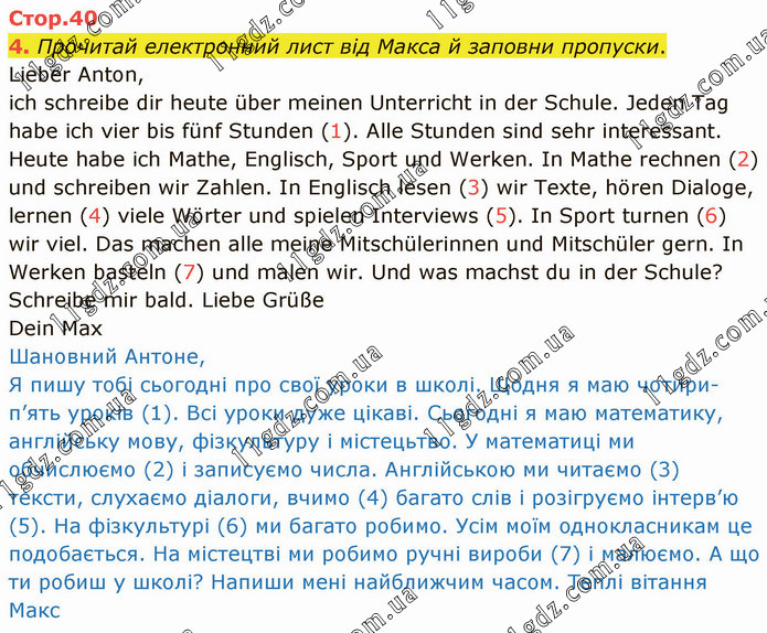 Прочитай електронний лист від Макса й заповни пропуски. Lieber Anton, ich schreibe dir heute über meinen Unterricht in der Schule. Jeden Tag habe ich vier bis fünf Stunden (1). Alle Stunden sind sehr interessant. Heute habe ich Mathe, Englisch, Sport und Werken. In Mathe rechnen (2) und schreiben wir Zahlen. In Englisch lesen (3) wir Texte, hören Dialoge, lernen (4) viele Wörter und spielen Interviews (5). In Sport turnen (6) wir viel. Das machen alle meine Mitschülerinnen und Mitschüler gern. In Werken basteln (7) und malen wir. Und was machst du in der Schule? Schreibe mir bald. Liebe Grüße Dein Max Шановний Антоне, Я пишу тобі сьогодні про свої уроки в школі. Щодня я маю чотири-п’ять уроків (1). Всі уроки дуже цікаві. Сьогодні я маю математику, англійську мову, фізкультуру і містецьтво. У математиці ми обчислюємо (2) і записуємо числа. Англійською ми читаємо (3) тексти, слухаємо діалоги, вчимо (4) багато слів і розігруємо інтерв’ю (5). На фізкультурі (6) ми багато робимо. Усім моїм однокласникам це подобається. На містецтві ми робимо ручні вироби (7) і малюємо. А що ти робиш у школі? Напиши мені найближчим часом. Теплі вітання Макс