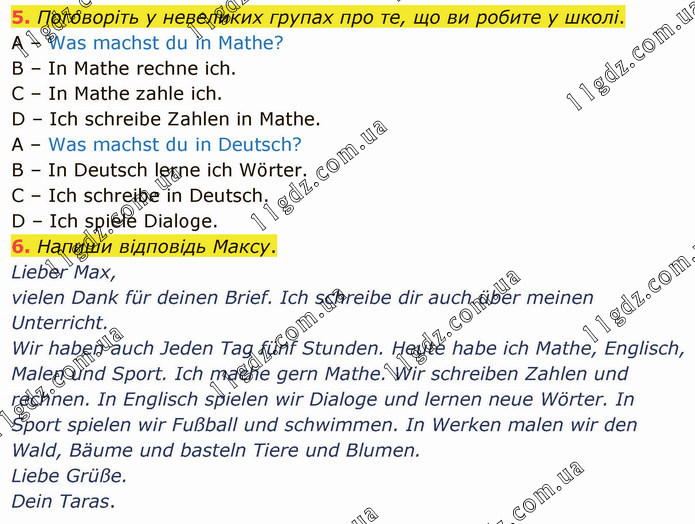 Поговоріть у невеликих групах про те, що ви робите у школі. A – Was machst du in Mathe? B – In Mathe rechne ich. C – In Mathe zahle ich. D – Ich schreibe Zahlen in Mathe. A – Was machst du in Deutsch? B – In Deutsch lerne ich Wörter. C – Ich schreibe in Deutsch. D – Ich spiele Dialoge. 6. Напиши відповідь Максу. Lieber Max, vielen Dank für deinen Brief. Ich schreibe dir auch über meinen Unterricht. Wir haben auch Jeden Tag fünf Stunden. Heute habe ich Mathe, Englisch, Malen und Sport. Ich mache gern Mathe. Wir schreiben Zahlen und rechnen. In Englisch spielen wir Dialoge und lernen neue Wörter. In Sport spielen wir Fußball und schwimmen. In Werken malen wir den Wald, Bäume und basteln Tiere und Blumen. Liebe Grüße. Dein Taras.