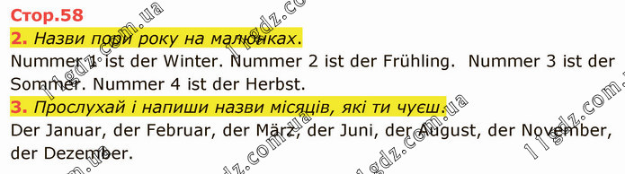 Назви пори року на малюнках. Nummer 1 ist der Winter. Nummer 2 ist der Frühling. Nummer 3 ist der Sommer. Nummer 4 ist der Herbst. 3. Прослухай і напиши назви місяців, які ти чуєш. Der Januar, der Februar, der März, der Juni, der August, der November, der Dezember.