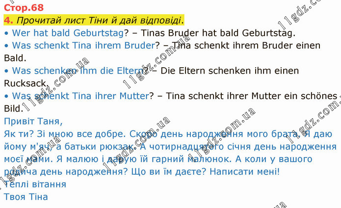 Прочитай лист Тіни й дай відповіді. • Wer hat bald Geburtstag? – Tinas Bruder hat bald Geburtstag. • Was schenkt Tina ihrem Bruder? – Tina schenkt ihrem Bruder einen Bald. • Was schenken ihm die Eltern? – Die Eltern schenken ihm einen Rucksack. • Was schenkt Tina ihrer Mutter? – Tina schenkt ihrer Mutter ein schönes Bild. Привіт Таня, Як ти? Зі мною все добре. Скоро день народження мого брата. Я даю йому м'яч, а батьки рюкзак. А чотирнадцятого січня день народження моєї мами. Я малюю і дарую їй гарний малюнок. А коли у вашого родича день народження? Що ви їм даєте? Написати мені! Теплі вітання Твоя Тіна