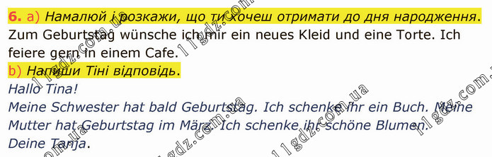 а) Намалюй і розкажи, що ти хочеш отримати до дня народження. Zum Geburtstag wünsche ich mir ein neues Kleid und eine Torte. Ich feiere gern in einem Cafe. b) Напиши Тіні відповідь. Hallo Tina! Meine Schwester hat bald Geburtstag. Ich schenke ihr ein Buch. Meine Mutter hat Geburtstag im März. Ich schenke ihr schöne Blumen. Deine Tanja.