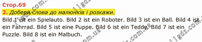 Добери слова до малюнків і розкажи. Bild 1 ist ein Spielauto. Bild 2 ist ein Roboter. Bild 3 ist ein Ball. Bild 4 ist ein Fahrrad. Bild 5 ist eine Puppe. Bild 6 ist ein Teddy. Bild 7 ist ein Puzzle. Bild 8 ist ein Malbuch.