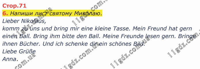 Напиши лист святому Миколаю. Lieber Nikolaus, komm zu uns und bring mir eine kleine Tasse. Mein Freund hat gern einen Ball. Bring ihm bitte den Ball. Meine Freunde lesen gern. Bringe ihnen Bücher. Und ich schenke dir ein schönes Bild. Liebe Grüße Anna.