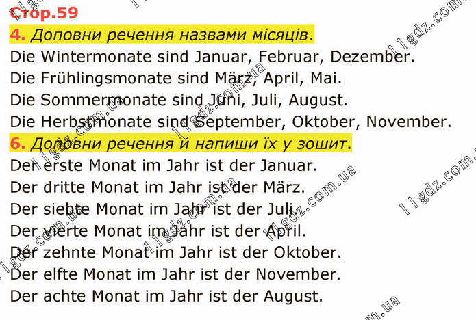 Доповни речення назвами місяців. Die Wintermonate sind Januar, Februar, Dezember. Die Frühlingsmonate sind März, April, Mai. Die Sommermonate sind Juni, Juli, August. Die Herbstmonate sind September, Oktober, November. 6. Доповни речення й напиши їх у зошит. Der erste Monat im Jahr ist der Januar. Der dritte Monat im Jahr ist der März. Der siebte Monat im Jahr ist der Juli. Der vierte Monat im Jahr ist der April. Der zehnte Monat im Jahr ist der Oktober. Der elfte Monat im Jahr ist der November. Der achte Monat im Jahr ist der August.