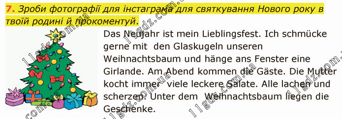 Зроби фотографії для інстаграма для святкування Нового року в твоїй родині й прокоментуй. Das Neujahr ist mein Lieblingsfest. Ich schmücke gerne mit den Glaskugeln unseren Weihnachtsbaum und hänge ans Fenster eine Girlande. Am Abend kommen die Gäste. Die Mutter kocht immer viele leckere Salate. Alle lachen und scherzen. Unter dem Weihnachtsbaum liegen die Geschenke.