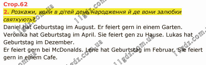 Розкажи, коли в дітей день народження й де вони залюбки святкують? Daniel hat Geburtstag im August. Er feiert gern in einem Garten. Veronika hat Geburtstag im April. Sie feiert gen zu Hause. Lukas hat Geburtstag im Dezember. Er feiert gern bei McDonalds. Lene hat Geburtstag im Februar. Sie feiert gern in einem Cafe.