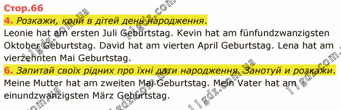 Розкажи, коли в дітей день народження. Leonie hat am ersten Juli Geburtstag. Kevin hat am fünfundzwanzigsten Oktober Geburtstag. David hat am vierten April Geburtstag. Lena hat am vierzehnten Mai Geburtstag. 6. Запитай своїх рідних про їхні дати народження. Занотуй и розкажи. Meine Mutter hat am zweiten Mai Geburtstag. Mein Vater hat am einundzwanzigsten März Geburtstag.