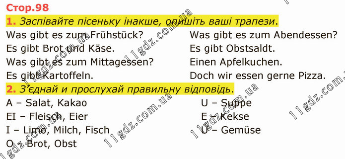 Заспівайте пісеньку інакше, опишіть ваші трапези. Was gibt es zum Frühstück? Es gibt Brot und Käse. Was gibt es zum Mittagessen? Es gibt Kartoffeln. Was gibt es zum Abendessen? Es gibt Obstsaldt. Einen Apfelkuchen. Doch wir essen gerne Pizza. 2. З’єднай и прослухай правильну відповідь. A – Salat, Kakao EI – Fleisch, Eier I – Limo, Milch, Fisch O – Brot, Obst U – Suppe E – Kekse Ü – Gemüse