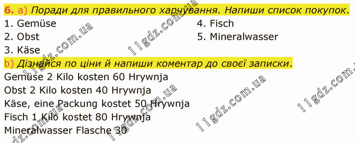 a) Поради для правильного харчування. Напиши список покупок. 1. Gemüse 2. Obst 3. Käse 4. Fisch 5. Mineralwasser b) Дізнайся по ціни й напиши коментар до своєї записки. Gemüse 2 Kilo kosten 60 Hrywnja Obst 2 Kilo kosten 40 Hrywnja Käse, eine Packung kostet 50 Hrywnja Fisch 1 Kilo kostet 80 Hrywnja Mineralwasser Flasche 30
