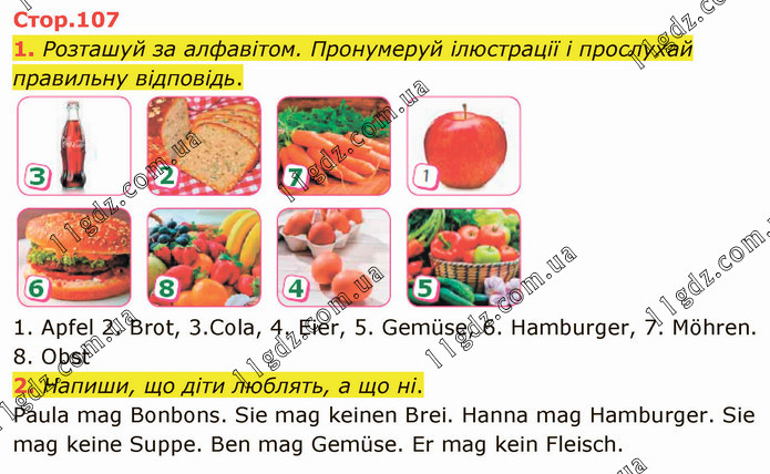 Розташуй за алфавітом. Пронумеруй ілюстрації і прослухай правильну відповідь. 1. Apfel 2. Brot, 3.Cola, 4. Eier, 5. Gemüse, 6. Hamburger, 7. Möhren. 8. Obst 2. Напиши, що діти люблять, а що ні. Paula mag Bonbons. Sie mag keinen Brei. Hanna mag Hamburger. Sie mag keine Suppe. Ben mag Gemüse. Er mag kein Fleisch.