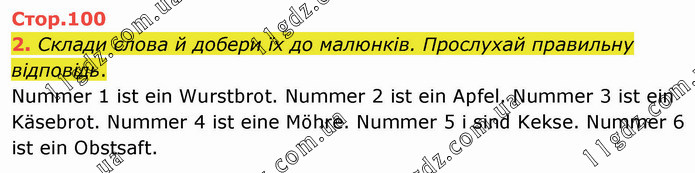 Склади слова й добери їх до малюнків. Прослухай правильну відповідь. Nummer 1 ist ein Wurstbrot. Nummer 2 ist ein Apfel. Nummer 3 ist ein Käsebrot. Nummer 4 ist eine Möhre. Nummer 5 i sind Kekse. Nummer 6 ist ein Obstsaft.