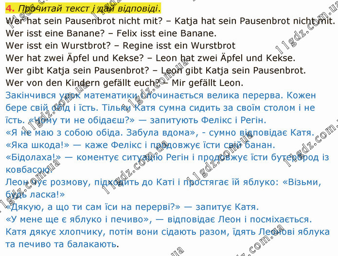 Прочитай текст і дай відповіді. Wer hat sein Pausenbrot nicht mit? – Katja hat sein Pausenbrot nicht mit. Wer isst eine Banane? – Felix isst eine Banane. Wer isst ein Wurstbrot? – Regine isst ein Wurstbrot Wer hat zwei Äpfel und Kekse? – Leon hat zwei Äpfel und Kekse. Wer gibt Katja sein Pausenbrot? – Leon gibt Katja sein Pausenbrot. Wer von den Kindern gefällt euch? – Mir gefällt Leon. Закінчився урок математики і починається велика перерва. Кожен бере свій обід і їсть. Тільки Катя сумна сидить за своїм столом і не їсть. «Чому ти не обідаєш?» — запитують Фелікс і Регін. «Я не маю з собою обіда. Забула вдома», - сумно відповідає Катя. «Яка шкода!» — каже Фелікс і продовжує їсти свій банан. «Бідолаха!» — коментує ситуацію Регін і продовжує їсти бутерброд із ковбасою. Леон чує розмову, підходить до Каті і простягає їй яблуко: «Візьми, будь ласка!» «Дякую, а що ти сам їси на перерві?» — запитує Катя. «У мене ще є яблуко і печиво», — відповідає Леон і посміхається. Катя дякує хлопчику, потім вони сідають разом, їдять Леонові яблука та печиво та балакають.