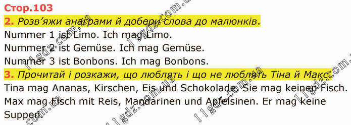 Розв’яжи анаграми й добери слова до малюнків. Nummer 1 ist Limo. Ich mag Limo. Nummer 2 ist Gemüse. Ich mag Gemüse. Nummer 3 ist Bonbons. Ich mag Bonbons. 3. Прочитай і розкажи, що люблять і що не люблять Тіна й Макс. Tina mag Ananas, Kirschen, Eis und Schokolade. Sie mag keinen Fisch. Max mag Fisch mit Reis, Mandarinen und Apfelsinen. Er mag keine Suppen.
