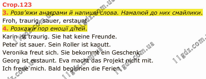 Розв’яжи анаграми й напиши слова. Намалюй до них смайлики. Froh, traurig, sauer, erstaunt 4. Розкажи пор емоції дітей. Karin ist traurig. Sie hat keine Freunde. Peter ist sauer. Sein Roller ist kaputt. Veronika freut sich. Sie bekommt ein Geschenk. Georg ist erstaunt. Eva macht das Projekt nicht mit. Ich freue mich. Bald beginnen die Ferien.