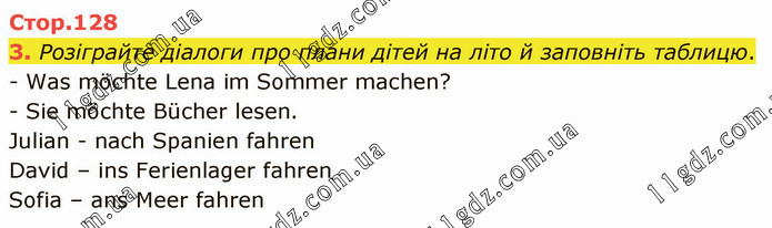 Розіграйте діалоги про плани дітей на літо й заповніть таблицю. - Was möchte Lena im Sommer machen? - Sie möchte Bücher lesen. Julian - nach Spanien fahren David – ins Ferienlager fahren Sofia – ans Meer fahren