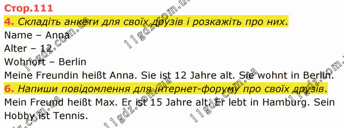 Складіть анкети для своїх друзів і розкажіть про них. Name – Anna Alter – 12 Wohnort – Berlin Meine Freundin heißt Anna. Sie ist 12 Jahre alt. Sie wohnt in Berlin. 6. Напиши повідомлення для інтернет-форуму про своїх друзів. Mein Freund heißt Max. Er ist 15 Jahre alt. Er lebt in Hamburg. Sein Hobby ist Tennis.