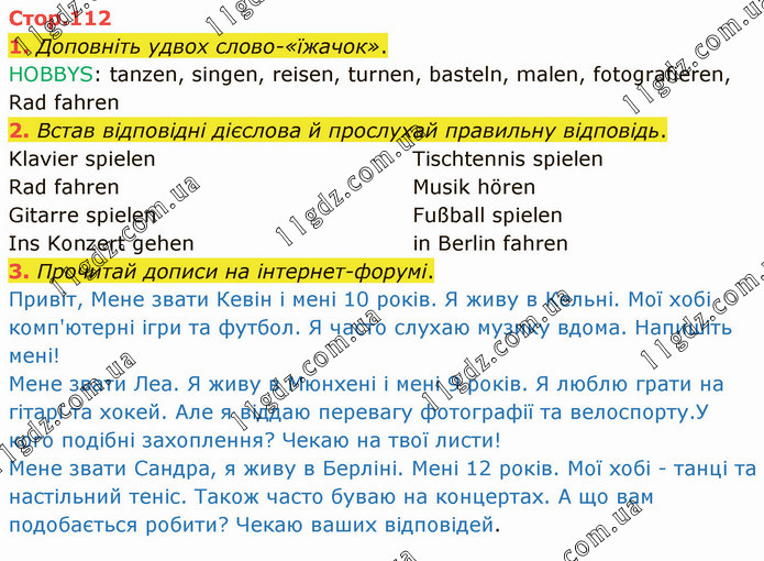 Доповніть удвох слово-«їжачок». HOBBYS: tanzen, singen, reisen, turnen, basteln, malen, fotografieren, Rad fahren 2. Встав відповідні дієслова й прослухай правильну відповідь. Klavier spielen Rad fahren Gitarre spielen Ins Konzert gehen Tischtennis spielen Musik hören Fußball spielen in Berlin fahren 3. Прочитай дописи на інтернет-форумі. Привіт, Мене звати Кевін і мені 10 років. Я живу в Кельні. Мої хобі комп'ютерні ігри та футбол. Я часто слухаю музику вдома. Напишіть мені! Мене звати Леа. Я живу в Мюнхені і мені 9 років. Я люблю грати на гітарі та хокей. Але я віддаю перевагу фотографії та велоспорту.У кого подібні захоплення? Чекаю на твої листи! Мене звати Сандра, я живу в Берліні. Мені 12 років. Мої хобі - танці та настільний теніс. Також часто буваю на концертах. А що вам подобається робити? Чекаю ваших відповідей.