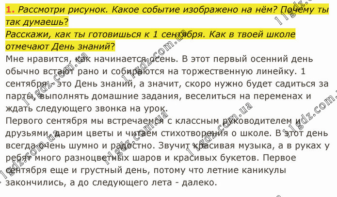 Рассмотри рисунок. Какое событие изображено на нём? Почему ты так думаешь? Расскажи, как ты готовишься к 1 сентября. Как в твоей школе отмечают День знаний? Мне нравится, как начинается осень. В этот первый осенний день обычно встают рано и собираются на торжественную линейку. 1 сентября - это День знаний, а значит, скоро нужно будет садиться за парты, выполнять домашние задания, веселиться на переменах и ждать следующего звонка на урок. Первого сентября мы встречаемся с классным руководителем и друзьями, дарим цветы и читаем стихотворения о школе. В этот день всегда очень шумно и радостно. Звучит красивая музыка, а в руках у ребят много разноцветных шаров и красивых букетов. Первое сентября еще и грустный день, потому что летние каникулы закончились, а до следующего лета - далеко.