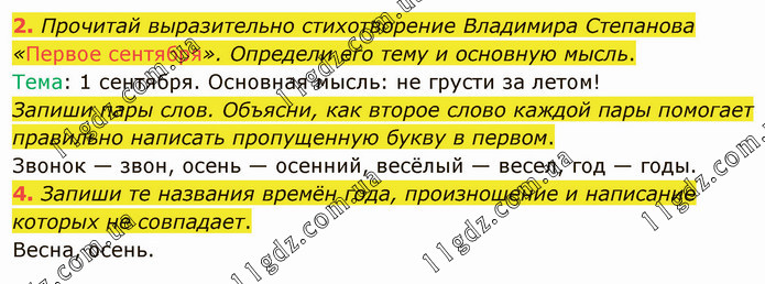 Прочитай выразительно стихотворение Владимира Степанова «Первое сентября». Определи его тему и основную мысль. Тема: 1 сентября. Основная мысль: не грусти за летом! Запиши пары слов. Объясни, как второе слово каждой пары помогает правильно написать пропущенную букву в первом. Звонок — звон, осень — осенний, весёлый — весел, год — годы. 4. Запиши те названия времён года, произношение и написание которых не совпадает. Весна, осень.