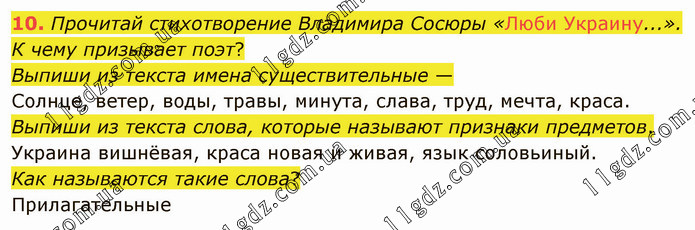 Прочитай стихотворение Владимира Сосюры «Люби Украину...». К чему призывает поэт? Выпиши из текста имена существительные — Солнце, ветер, воды, травы, минута, слава, труд, мечта, краса. Выпиши из текста слова, которые называют признаки предметов. Украина вишнёвая, краса новая и живая, язык соловьиный. Как называются такие слова? Прилагательные