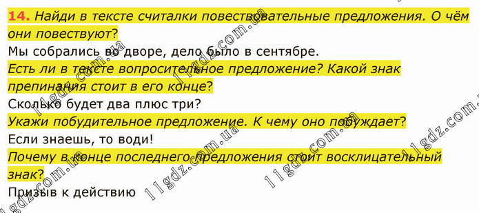 Найди в тексте считалки повествовательные предложения. О чём они повествуют? Мы собрались во дворе, дело было в сентябре. Есть ли в тексте вопросительное предложение? Какой знак препинания стоит в его конце? Сколько будет два плюс три? Укажи побудительное предложение. К чему оно побуждает? Если знаешь, то води! Почему в конце последнего предложения стоит восклицательный знак? Призыв к действию