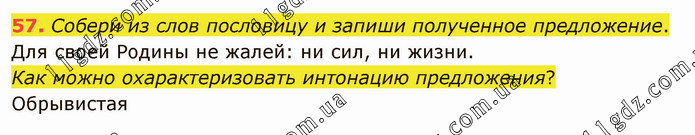 Собери из слов пословицу и запиши полученное предложение. Для своей Родины не жалей: ни сил, ни жизни. Как можно охарактеризовать интонацию предложения? Обрывистая