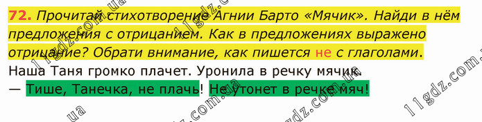 Прочитай стихотворение Агнии Барто «Мячик». Найди в нём предложения с отрицанием. Как в предложениях выражено отрицание? Обрати внимание, как пишется не с глаголами. Наша Таня громко плачет. Уронила в речку мячик. — Тише, Танечка, не плачь! Не утонет в речке мяч!