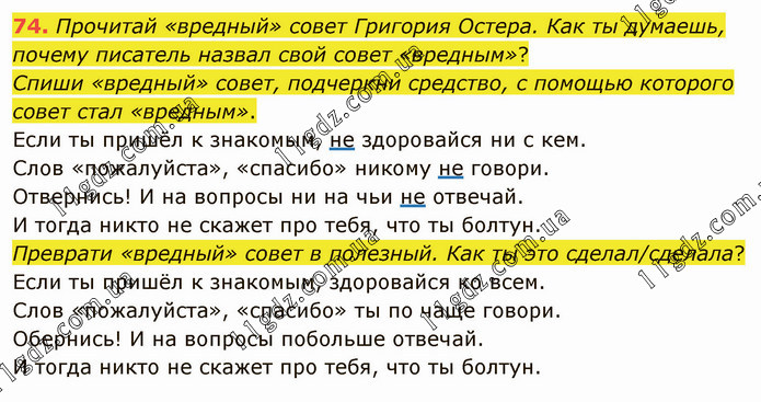 Прочитай «вредный» совет Григория Остера. Как ты думаешь, почему писатель назвал свой совет «вредным»? Спиши «вредный» совет, подчеркни средство, с помощью которого совет стал «вредным». Если ты пришёл к знакомым, не здоровайся ни с кем. Слов «пожалуйста», «спасибо» никому не говори. Отвернись! И на вопросы ни на чьи не отвечай. И тогда никто не скажет про тебя, что ты болтун. Преврати «вредный» совет в полезный. Как ты это сделал/сделала? Если ты пришёл к знакомым, здоровайся ко всем. Слов «пожалуйста», «спасибо» ты по чаще говори. Обернись! И на вопросы побольше отвечай. И тогда никто не скажет про тебя, что ты болтун.