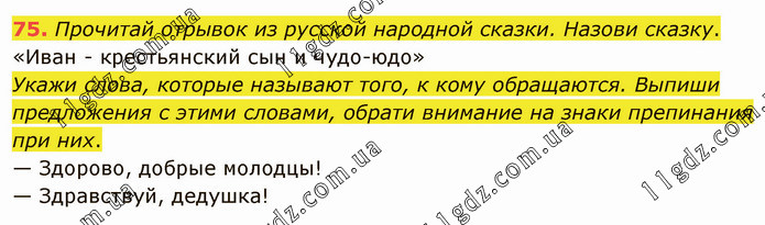 Прочитай отрывок из русской народной сказки. Назови сказку. «Иван - крестьянский сын и чудо-юдо» Укажи слова, которые называют того, к кому обращаются. Выпиши предложения с этими словами, обрати внимание на знаки препинания при них. — Здорово, добрые молодцы! — Здравствуй, дедушка!