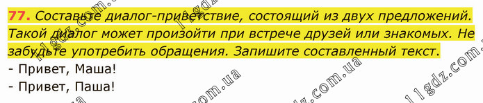 Составьте диалог-приветствие, состоящий из двух предложений. Такой диалог может произойти при встрече друзей или знакомых. Не забудьте употребить обращения. Запишите составленный текст. - Привет, Маша! - Привет, Паша!