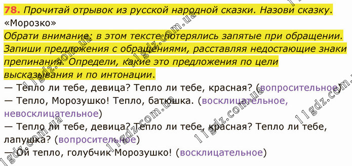 Прочитай отрывок из русской народной сказки. Назови сказку. «Морозко» Обрати внимание: в этом тексте потерялись запятые при обращении. Запиши предложения с обращениями, расставляя недостающие знаки препинания. Определи, какие это предложения по цели высказывания и по интонации. — Тепло ли тебе, девица? Тепло ли тебе, красная? (вопросительное) — Тепло, Морозушко! Тепло, батюшка. (восклицательное, невосклицательное) — Тепло ли тебе, девица? Тепло ли тебе, красная? Тепло ли тебе, лапушка? (вопросительное) — Ой тепло, голубчик Морозушко! (восклицательное)