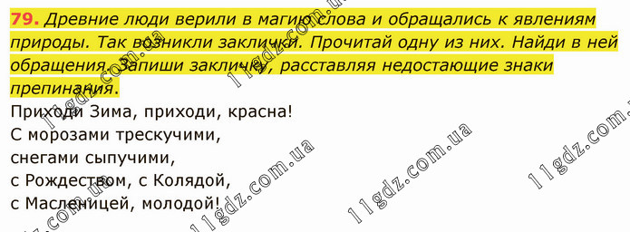 Древние люди верили в магию слова и обращались к явлениям природы. Так возникли заклички. Прочитай одну из них. Найди в ней обращения. Запиши закличку, расставляя недостающие знаки препинания. Приходи Зима, приходи, красна! С морозами трескучими, снегами сыпучими, с Рождеством, с Колядой, с Масленицей, молодой!