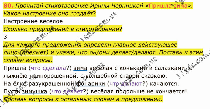 Прочитай стихотворение Ирины Черницкой «Пришла зима». Какое настроение оно создаёт? Настроение веселое Сколько предложений в стихотворении? 3 Для каждого предложения определи главное действующее лицо (предмет) и укажи, что он/они делает/делают. Поставь к этим словам вопросы. Пришла (что сделала?) зима весёлая с коньками и салазками, с лыжнёю припорошенной, с волшебной старой сказкою. На ёлке разукрашенной фонарики (что делают?) качаются. Пусть зимушка (что делает?) весёлая подольше не кончается! Поставь вопросы к остальным словам в предложении.
