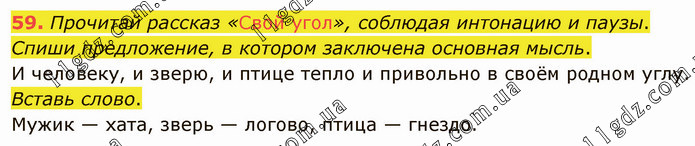 Прочитай рассказ «Свой угол», соблюдая интонацию и паузы. Спиши предложение, в котором заключена основная мысль. И человеку, и зверю, и птице тепло и привольно в своём родном углу. Вставь слово. Мужик — хата, зверь — логово, птица — гнездо.