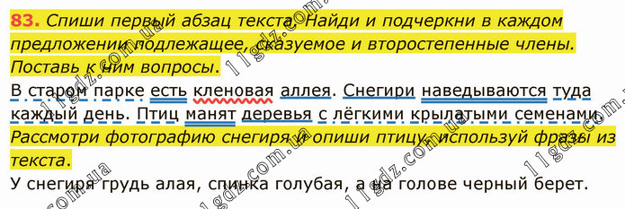 Спиши первый абзац текста. Найди и подчеркни в каждом предложении подлежащее, сказуемое и второстепенные члены. Поставь к ним вопросы. В старом парке есть кленовая аллея. Снегири наведываются туда каждый день. Птиц манят деревья с лёгкими крылатыми семенами. Рассмотри фотографию снегиря и опиши птицу, используй фразы из текста. У снегиря грудь алая, спинка голубая, а на голове черный берет.