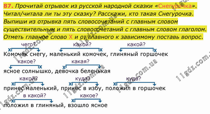 Прочитай отрывок из русской народной сказки «Снегурочка». Читал/читала ли ты эту сказку? Расскажи, кто такая Снегурочка. Выпиши из отрывка пять словосочетаний с главным словом существительным и пять словосочетаний с главным словом глаголом. Отметь главное слово Х и от главного к зависимому поставь вопрос. чего? какой? какой? Комочек снегу, маленький комочек, глиняный горшочек какое? какая? ясное солнышко, девочка беленькая какой? куда? куда? принес маленький, принес в избу, положил в горшочек в какой? какое? положил в глиняный, взошло ясное