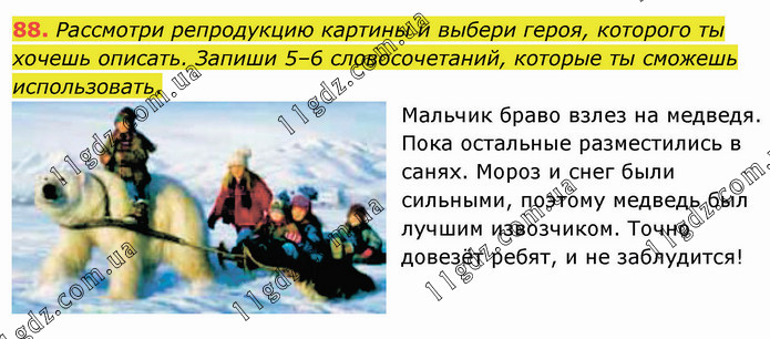 Рассмотри репродукцию картины и выбери героя, которого ты хочешь описать. Запиши 5–6 словосочетаний, которые ты сможешь использовать. Мальчик браво взлез на медведя. Пока остальные разместились в санях. Мороз и снег были сильными, поэтому медведь был лучшим извозчиком. Точно довезёт ребят, и не заблудится!