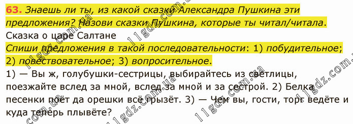 Знаешь ли ты, из какой сказки Александра Пушкина эти предложения? Назови сказки Пушкина, которые ты читал/читала. Сказка о царе Салтане Спиши предложения в такой последовательности: 1) побудительное; 2) повествовательное; 3) вопросительное. 1) — Вы ж, голубушки-сестрицы, выбирайтесь из светлицы, поезжайте вслед за мной, вслед за мной и за сестрой. 2) Белка песенки поёт да орешки всё грызёт. 3) — Чем вы, гости, торг ведёте и куда теперь плывёте?