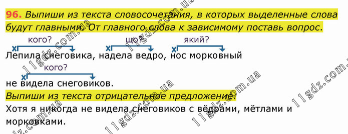 Выпиши из текста словосочетания, в которых выделенные слова будут главными. От главного слова к зависимому поставь вопрос. кого? що? який? Лепила снеговика, надела ведро, нос морковный кого? не видела снеговиков. Выпиши из текста отрицательное предложение. Хотя я никогда не видела снеговиков с вёдрами, мётлами и морковками.