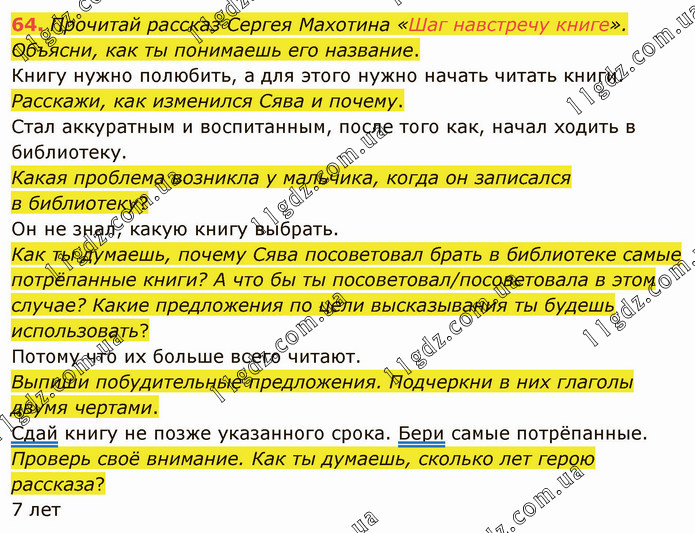 Прочитай рассказ Сергея Махотина «Шаг навстречу книге». Объясни, как ты понимаешь его название. Книгу нужно полюбить, а для этого нужно начать читать книги. Расскажи, как изменился Сява и почему. Стал аккуратным и воспитанным, после того как, начал ходить в библиотеку. Какая проблема возникла у мальчика, когда он записался в библиотеку? Он не знал, какую книгу выбрать. Как ты думаешь, почему Сява посоветовал брать в библиотеке самые потрёпанные книги? А что бы ты посоветовал/посоветовала в этом случае? Какие предложения по цели высказывания ты будешь использовать? Потому что их больше всего читают. Выпиши побудительные предложения. Подчеркни в них глаголы двумя чертами. Сдай книгу не позже указанного срока. Бери самые потрёпанные. Проверь своё внимание. Как ты думаешь, сколько лет герою рассказа? 7 лет