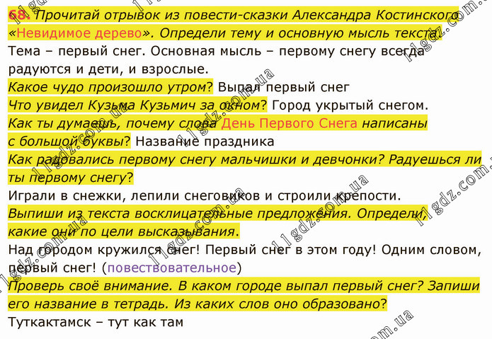 Прочитай отрывок из повести-сказки Александра Костинского «Невидимое дерево». Определи тему и основную мысль текста. Тема – первый снег. Основная мысль – первому снегу всегда радуются и дети, и взрослые. Какое чудо произошло утром? Выпал первый снег Что увидел Кузьма Кузьмич за окном? Город укрытый снегом. Как ты думаешь, почему слова День Первого Снега написаны с большой буквы? Название праздника Как радовались первому снегу мальчишки и девчонки? Радуешься ли ты первому снегу? Играли в снежки, лепили снеговиков и строили крепости. Выпиши из текста восклицательные предложения. Определи, какие они по цели высказывания. Над городом кружился снег! Первый снег в этом году! Одним словом, первый снег! (повествовательное) Проверь своё внимание. В каком городе выпал первый снег? Запиши его название в тетрадь. Из каких слов оно образовано? Туткактамск – тут как там