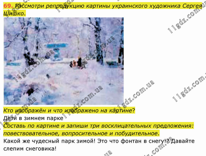 Рассмотри репродукцию картины украинского художника Сергея Шишко. Кто изображён и что изображено на картине? Дети в зимнем парке Составь по картине и запиши три восклицательных предложения: повествовательное, вопросительное и побудительное. Какой же чудесный парк зимой! Это что фонтан в снегу!? Давайте слепим снеговика!
