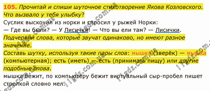 Прочитай и спиши шуточное стихотворение Якова Козловского. Что вызвало у тебя улыбку? Суслик выскочил из норки и спросил у рыжей Норки: — Где вы были? — У Лисички! — Что вы ели там? — Лисички. Подчеркни слова, которые звучат одинаково, но имеют разное значение. Составь шутку, используя такие пары слов: мышка (зверёк) — мышка (компьютерная); есть (иметь) — есть (принимать пищу) или другие подобные слова. мышка бежит, по компьютеру бежит виртуальный сыр-пробел пишет стрелкой словно мел.