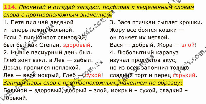 Прочитай и отгадай загадки, подбирая к выделенным словам слова с противоположным значением. 1. Петя пил чай ледяной и теперь лежит больной. Если б пил компот сливовый, был бы, как Степан, здоровый. 2. Нынче пасмурный день был, Глеб зонт взял, а Лев — забыл. Дождь пролился неплохой. Лев — весь мокрый, Глеб — сухой! 3. Вася птичкам сыплет крошки. Жору все боятся кошки — он гоняет их метлой. Вася — добрый, Жора — злой! 4. Любопытный карапуз изучал продуктов вкус, но из всех запомнил только сладкий торт и перец горький. Запиши пары слов с противоположным значением по образцу: Больной – здоровый, добрый – злой, мокрый – сухой, сладкий – горький.