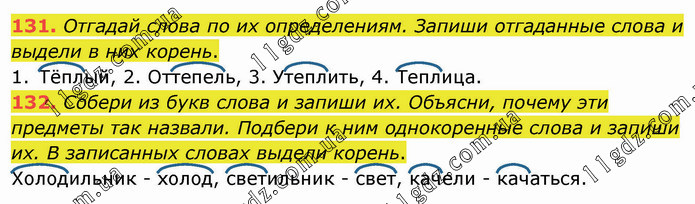 Отгадай слова по их определениям. Запиши отгаданные слова и выдели в них корень. 1. Тёплый, 2. Оттепель, 3. Утеплить, 4. Теплица. 132. Собери из букв слова и запиши их. Объясни, почему эти предметы так назвали. Подбери к ним однокоренные слова и запиши их. В записанных словах выдели корень. Холодильник - холод, светильник - свет, качели - качаться.