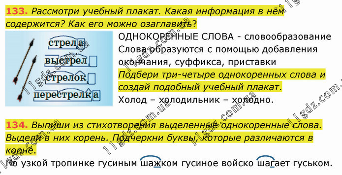 Рассмотри учебный плакат. Какая информация в нём содержится? Как его можно озаглавить? ОДНОКОРЕННЫЕ СЛОВА - словообразование Слова образуются с помощью добавления окончания, суффикса, приставки Подбери три-четыре однокоренных слова и создай подобный учебный плакат. Холод – холодильник – холодно. 134. Выпиши из стихотворения выделенные однокоренные слова. Выдели в них корень. Подчеркни буквы, которые различаются в корне. По узкой тропинке гусиным шажком гусиное войско шагает гуськом.